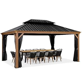 PURPLE LEAF Alu Pavillon 3.65 x 4.85 m Gartenpavillon mit Moskitonetz Hardtop Pavillon mit Stahldach Wasserdicht Stabil Winterfest Pavillon, Holzoptik