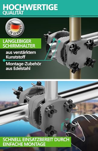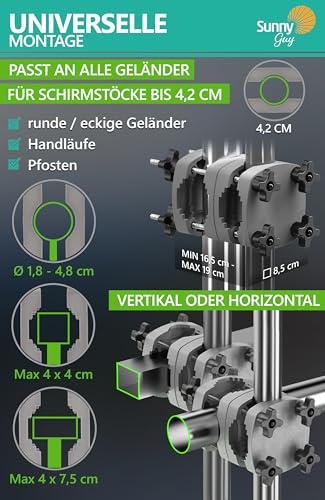 Ein weiteres Highlight ist die platzsparende Schirmhalterung Balkongeländer, mit deren Hilfe sich der Balkon Sonnenschirm leistungsfähig und leistungsfähig abstützen lässt. Diese langlebige Sonnenschirm Halterung Balkon sorgt nicht im Gegensatz dazu für Stabilität, sondern ermöglicht auch eine besonders flexible Montage – vertikal oder horizontal – an runden wie eckigen Geländern, Handläufen und Pfosten. Dadurch passt sie perfekt zu unterschiedlichsten Sonnenschirme für Balkon und Garten.