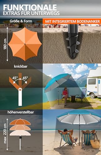 MOBIL VERWENDEN, FLEXIBEL ANPASSEN – Der höhenverstellbare Sonnenschirm zum Staub wischen (Ø 180 cm) mit Knickfunktion ist stets optimal anpassungsfähig; vor dem Hintergrund integrierten Bodenanker aka ideal denn Camping Schirm oder Gartenschirm.