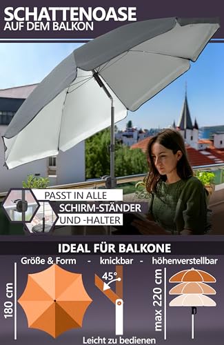 KOMFORTABEL ZU BEDIENEN – Leichtgängige Mechanik, praktische Größe Ø 180 cm, langlebige Qualität. Der robuste SunnyJoy überzeugt qua Strand-, Balkon- und Gartenschirm