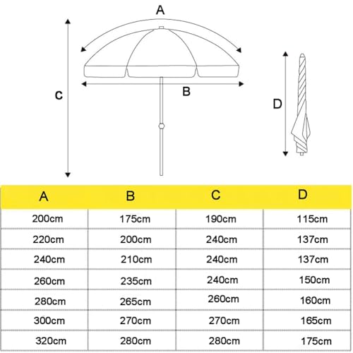Schirmkrümmung: 220 cm (7,2 ft), 240 cm (7,8 ft), 260 cm (8,5 ft), 280 cm (9 ft), 300 cm (9,8 ft)