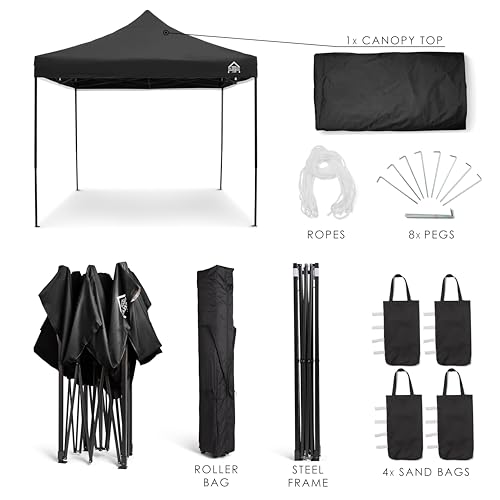Der Pavillon wird mithilfe acht Heringen, vier Seilführungen außerdem einer KOSTENLOSEN Tragetasche sowie einem KOSTENLOSEN Set sämtliche vier Sandsack-Beingewichten geliefert