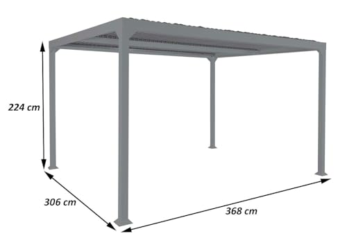 Dimensionen (HxLxB): 224x368x306cm | Material: Gestell: Pulverbeschichtetes Aluminium – Lamellen: Aluminium – Schrauben: 304 Edelstahl – Materialdicke: 2,00 mm | Farbe: Anthrazit
