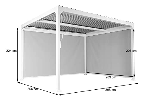 Dimensionen (HxLxB): 224x306x306cm | Material: Gestell: pulverbeschichtetes Aluminium – Lamellen: Aluminium – Rahmen Seitenwand: Aluminium – Seitenwand: Stoff/Textil (70% Polyvinylchlorid, 30% Polyester) – Schrauben: 304 Edelstahl – Materialdicke: