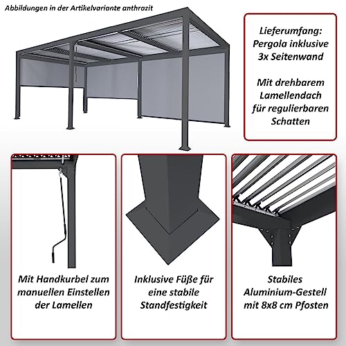 Lieferumfang: Pergola inklusive 3x Seitenwand | In unterschiedlichen Ausführungen erhältlich | Stufenlos regulierbarer Wind- und Insektenschutz | Mit drehbarem Lamellendach für regulierbaren Schatten | Mit Handkurbel zum manuellen Einstellen der Lamellen