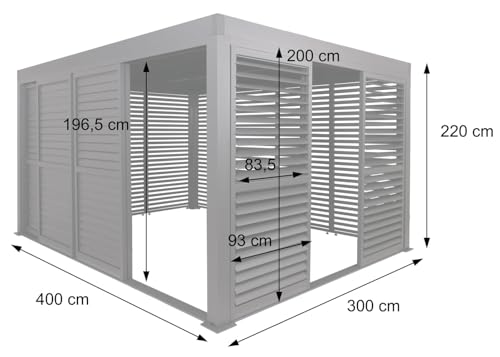 Dimensionen (HxLxB): 220x300x400cm | Material: Pergola / Schiebetüren / Lamellen-Paneele: Pulverbeschichtetes Aluminium – Kurbel: Stahl (95%) + Kunststoff (5%) – Schrauben: Stahl | Farbe: Anthrazit