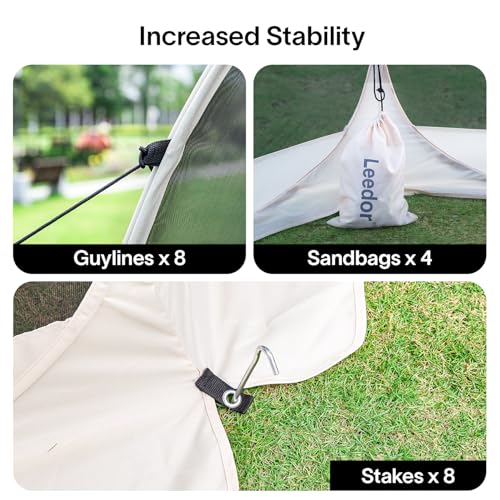 Zum Patent angemeldetes Design: Das Obermaterial bietet Sonnenschutz mit LSF 50+, hält starke Sonneneinstrahlung ab, ist nicht wasser- bzw. regendicht. Eine große Eingangstür mit beidseitigem Silikonreißverschluss, leicht von innen und außen zu öffnen. 4 Netzwände schützen Familie und Lebensmittel. Isoliert Haken für Mantel, Tasche usw. 4 längliche Sandsäcke, 8 Abspannleinen und 8 Metallheringe umsorgen zusätzliche Stabilität bei windigen Bedingungen.