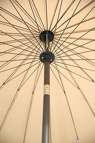 Dieser Sonnenschutz kann mit der Kurbel leicht geöffnet und geschlossen werden. Es gibt 24 Aluminium-Rippen die 2,50 Meter klassischen Stoff und geben dem Schirm eine Steady-Form. Einfach zu bedienendes Kurbellift-System und eine Neigungsoption, die auch Schutz bei einem Fuß in der Sonne bietet.