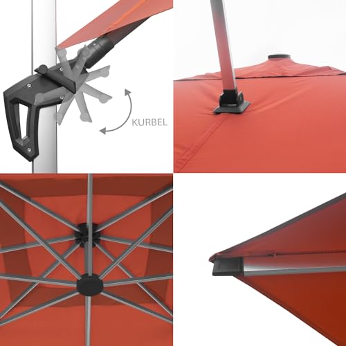 Schirm 360 Stufung um den Stamm drehbar – stabiler Kronenmechanismus mit 8 Streben – Schirmkrone zusätzlich neigbar und schwenkbar – optimaler Schattenwurf bei jedem Sonnenstand