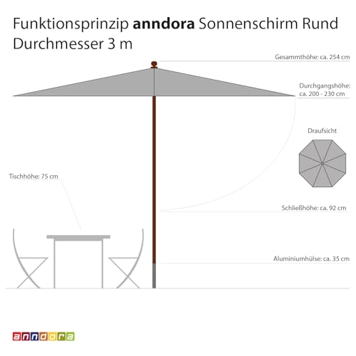 Der Schirmstoff überzeugt mit seiner Robustheit und schmutzabweisenden Eigenschaften. Mit einer UV-Einsaugung von 97,5 % bietet er effektiven Abschirmung vor schädlichen UV-Strahlen. Mit Stoff verstärkte Ecken und eine zusätzliche Stoffverstärkung an der Schirmkrone unterbinden ungewolltes Ausreißen und garantieren eine lange Lebensdauer des Schirmstoffs. Bei Bedarf lässt sich der Schirmstoff mühelos abklingen und Geschirr spülen.