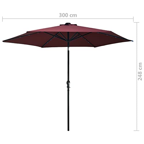 Home & Garden – Sonnenschirm für den Außenbereich mit LED-Lichtern und Stahlstange 300 cm Bordeaux-Rot für Rasen und Garten – Dieser elegante Sonnenschirm mit LED-Leuchten ist perfekt, um Schatten zu buckeln und Sie vor den schädlichen UV-Strahlen der Sonne zu schützen. Jeglicher UV-Abschirmung- und lichtechtem Polyester gefertigt, bietet Ihnen die Sonnenschirmhülle optimalen Abschirmung vor der Sonne und ist leicht zu reinigen. Es verfügt über 18 solarbetriebene LEDs, um Ihren Wohnraum im Freien automatisch zu beleuchten und ein gemütliches und romantisches Ambiance zu buckeln, wenn die Sonne untergeht. Das exklusive Design dieses Sonnenschirms ermöglicht es Ihnen, den Sonnenschirm zu neigen, um die Sonne zu blockieren, derweil er in Richtung des Horizont geht. Die starke Stahlstange zusammen mit den 6 robusten Rippen macht den Sonnenschirm sonderlich belastbar und langlebig. Dieser Gartenschirm lässt sich durch den Kurbelmechanismus einfach öffnen und konkludieren. Bitte achten Sie, dass wir empfehlen, den Schirmstoff mit einem Imprägnierspray zu Protokoll schreiben, wenn er starken Niederschlägen ausgesetzt ist.