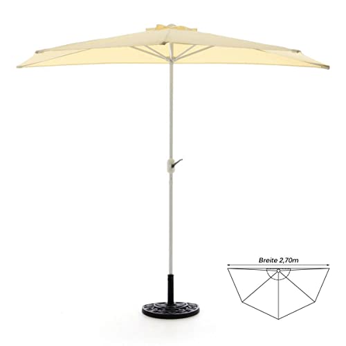 Gartenschirm, creme, halbrund sämtliche Polyester: 160 g/m². Der Schirm lässt sich unkompliziert mit der Kurbel öffnen. Er hat folgende Maße: Breite: 270 cm, Hölle: 140 cm, Gesamthöhe: 235cm.