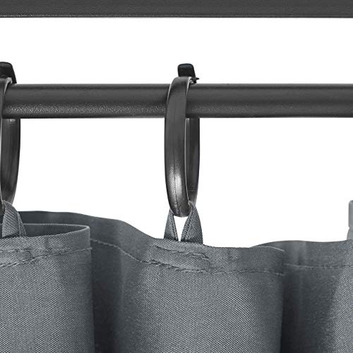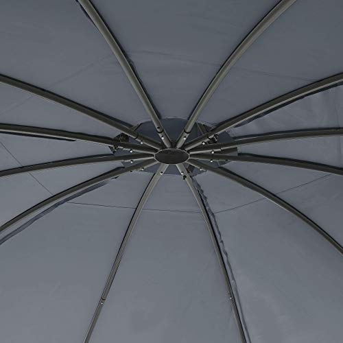 Moderner Gartenpavillon mit graphitgrauen Vorhängen und rundem Dach . Wind, Sonne oder Regenschauer? Die feinen, fantasievollen Ornamente, dekorativen Füße und langlebige, UV-Beständige Dach-Bespannung aufführen anstatt Sie einen überaus schönen, schattigen, wasser- und windbeständigen Rückzugsort. Je nach Bedarf können die robusten Polyester-Vorhänge von den Standpfosten gelöst und mit den praktischen Seitenbändern zusammengebunden werden. Um eine optimale Dauerhaftigkeit zu erlangen wird die zuverlässige, hochwertige Stahlkonstruktion mit robusten Heringen vervollkommnet.