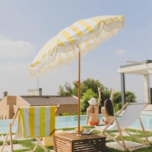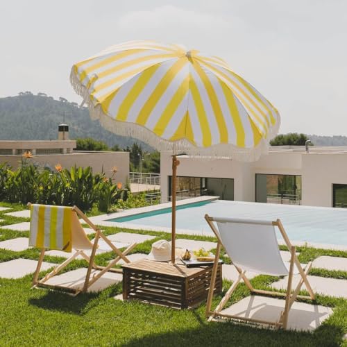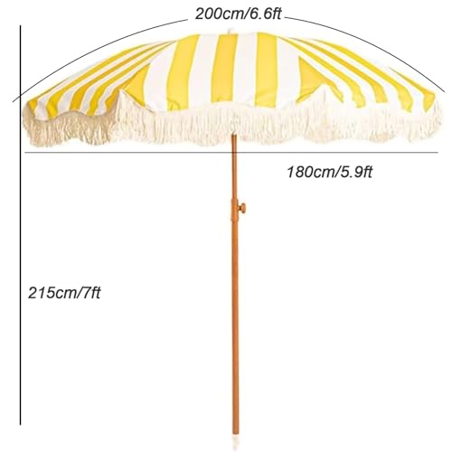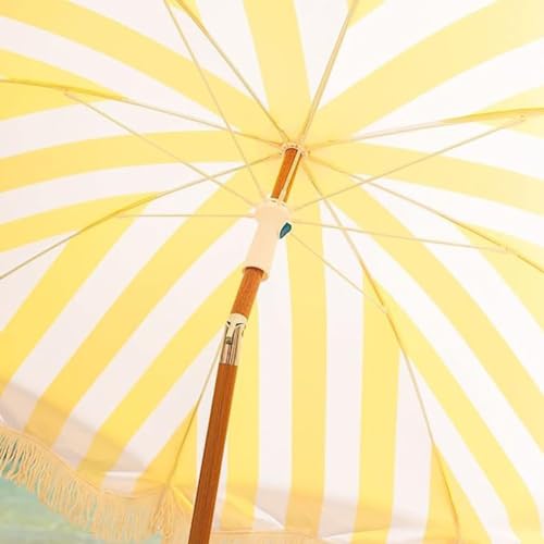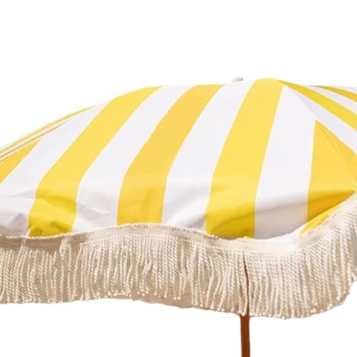 Strandurlaubsschirm, gelb-weiß gestreifter Monitor, anhand Holzmaserung, Metallstange, vermittelt tropische Strandatmosphäre, tragbares Gestaltung, anhand Tüte, bekömmlich zu versteifen im Freien, am Badestrand usw., kippbares Gestaltung, verstellbarer Monitor, also Jene den ganzen Tag im Freien sein können