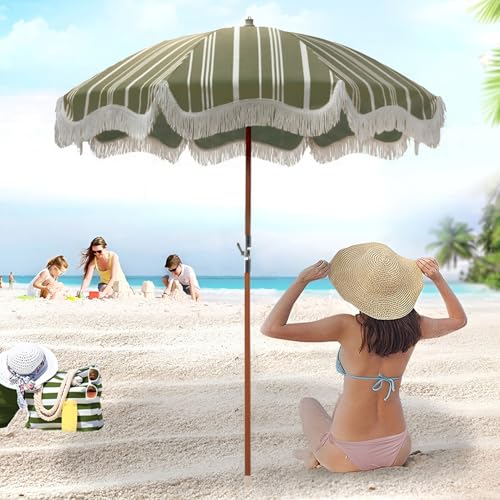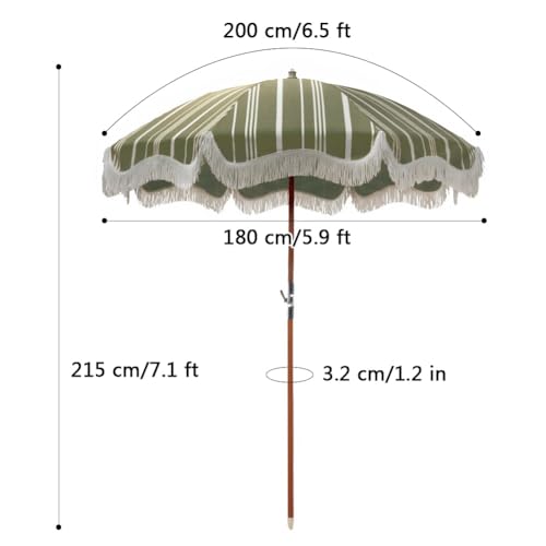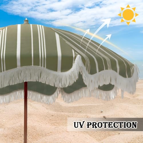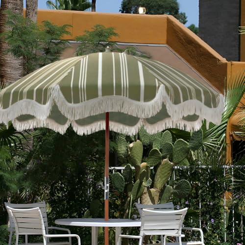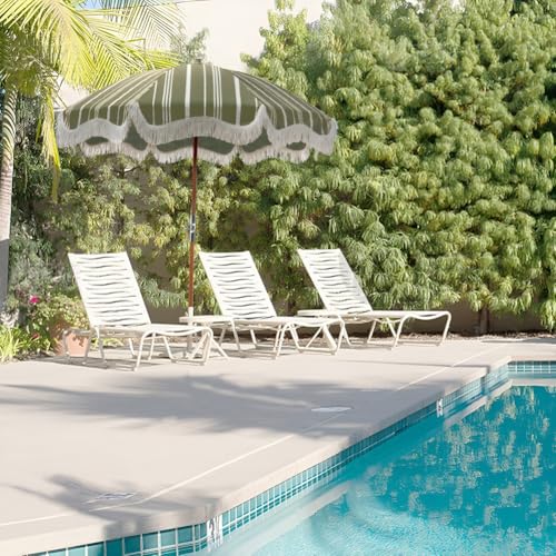 Strandschirm mit Quaste: Böhmischer, grün gestreifter Sonnenschirm mit fließenden Quasten, der sich in Strand, Garten oder Pool einfügt und modischen Charme ausstrahlt