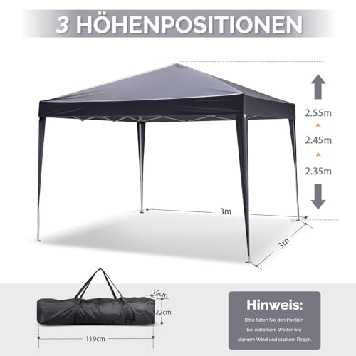 Vielseitiger Einsatz: Der Gartenpavillon hat eine Größe von 3 x 3 Metern und eine Höhe von 2,6 Metern. Mit einer Fläche von 9 Quadratmetern bietet er ausreichend Platz für 4 bis 6 Personen. Er eignet sich perfekt für die Nutzung auf Terrassen, Rasenflächen, Stränden und am Pool, sodass Sie die Sommertage in vollen Zügen genießen können.