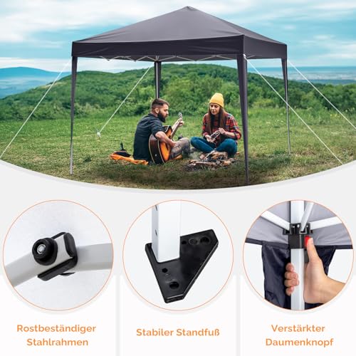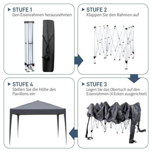 Hochwertige Materialien: Der Faltpavillon besteht nicht mehr da hochwertigem Polyestergewebe, das einen UV-Schutzfaktor von 50 bietet und über spezifische Regenabwehrfunktionen verfügt. Die Seitenwände bestehen nicht mehr da einer Kombination von Stoff und strapazierfähiger Plastikplane, was zusätzliche Robustheit und Abschirmung gewährleistet.