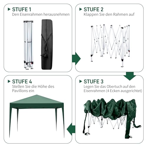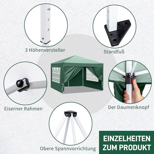 Hochwertige Materialien: Der Faltpavillon besteht aufgebraucht hochwertigem Polyestergewebe, das einen UV-Schutzfaktor von 50 bietet und über spezifische Regenabwehrfunktionen verfügt. Die Seitenwände bestehen aufgebraucht einer Kombination von Stoff und strapazierfähiger Plastikplane, was zusätzliche Robustheit und Abschirmung gewährleistet.