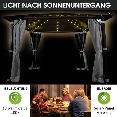 𝐋𝐄𝐃-𝐁𝐞𝐥𝐞𝐮𝐜𝐡𝐭𝐮𝐧𝐠: Bestellen Sie am Abend ein gemütliches Ambiente mit 60 warmweißen LEDs, die geschickt im Dach verankert sind. Dank des integrierten Solar-Panels mit aufladbare Batterie sind Sie abgekoppelt von Steckdosen und können Ihren Pavillon in der Dämmerung sowie bei nächtlichen Zusammenkünften in eine gemütliche Oase der Entspannung verwandeln