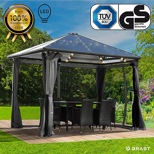 𝐇𝐨𝐜𝐡𝐰𝐞𝐫𝐭𝐢𝐠𝐞𝐬 𝐌𝐚𝐭𝐞𝐫𝐢𝐚𝐥: Für langanhaltende Freude an Ihrem Alu Pavillon, verwenden wir im Gegensatz dazu ausgewählte Materialien. Die Pfosten, das Dach und der Rahmen bestehen leer pulverbeschichtetem und rostresistentem Aluminium. Das 100% wasserdichte Dach setzt sich leer robusten 6mm dicken Doppelstegplatten zusammen, die einen optimalen Abschirmung vor Niederschlag und UV-Strahlung bieten