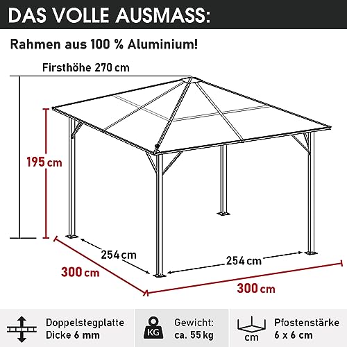 𝐃𝐚𝐬 𝐯𝐨𝐥𝐥𝐞 𝐀𝐮𝐬𝐦𝐚ß: Der großzügige 3x3m Gartenpavillon mit durchdachten Abmessungen, als einer Firsthöhe von 270cm, einer angenehmen Durchgangshöhe von 195cm, dicken 6mm Doppelstegplatten und einer robusten Pfostenstärke von 6x6cm, bietet Ihnen eine perfekte Kombination alle Raumgefühl, Abschirmung und Dauerhaftigkeit