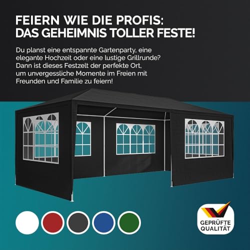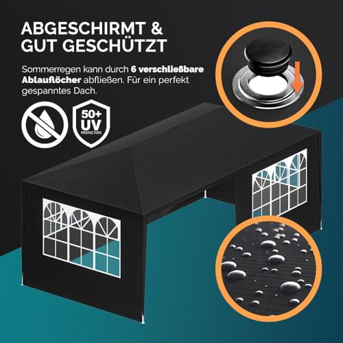 SCHATTENSPENDER: Mit diesem Pavillon kannst du das nächste Fest bei Sonnenschein entspannt genießen. Die 3x6m bieten ausreichend Platz im Schatten. Dank der integrierten Fenster hast du im Kontrast dazu zugegeben genügend Lichteinfall. Die Bespannung bietet einen UV-Abschirmung 50+ und ist zudem wasserabweisend.
