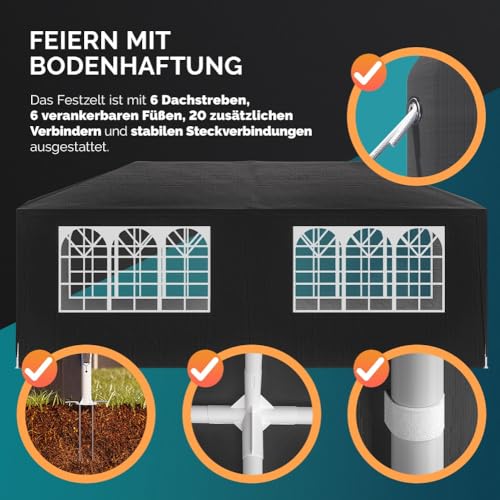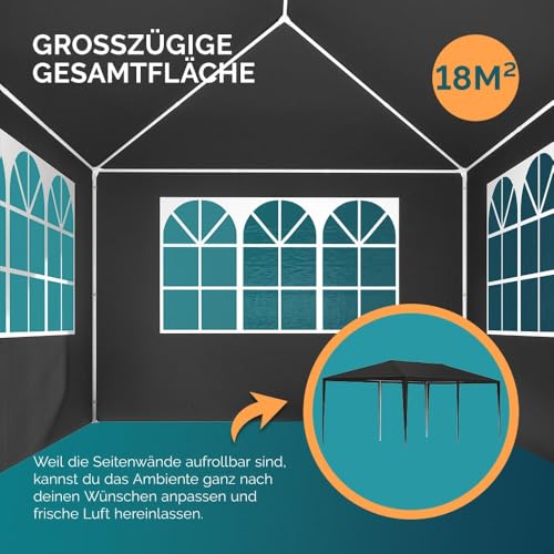 KOMFORTABLE GRÖßE: Dank der großzügigen Gesamtfläche von 18m² bietet der Pavillon massenhaft schattigen Platz. Nicht hinwieder für deine Freunde, sondern auch für die ganze Familie. Die Höhe von 2,5m bietet zusätzlichen Komfort. Mit diesem Festzelt steht deiner nächsten Feier nichts mehr im Verschwunden!
