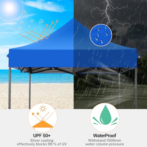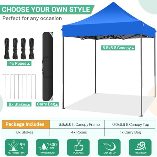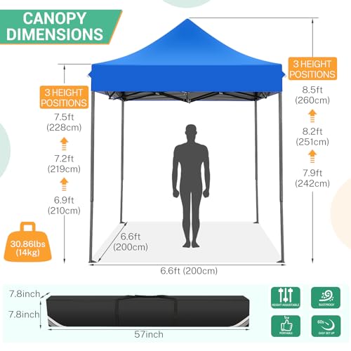 COBIZI 6,6×6,6 Pop-up-Pavillon ohne Seitenwände, Robustes Partyzelt für den Außenbereich, einfacher Aufbau, 100% wasserdichtes Hochzeitszelt, 3-Fach höhenverstellbar mit Tragetasche, Blau