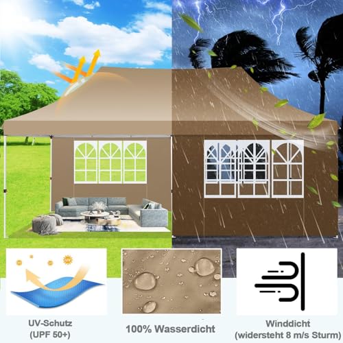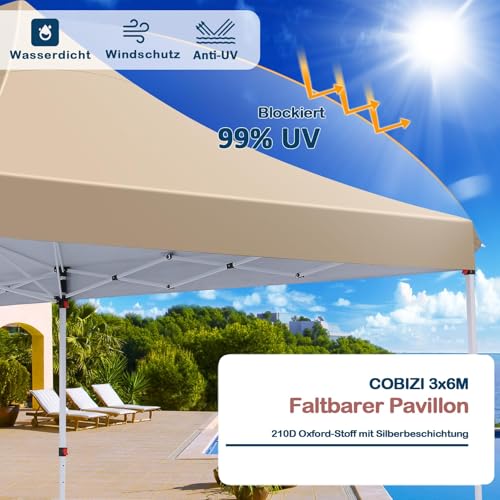 [Robuste und schützende Konstruktion]: Der Cobizi Faltpavillon 3x6m wasserdicht belastbar besteht die Gesamtheit hochwertigen Materialien. Das 210D Oxford-Gewebe ist mit einer speziellen Beschichtung versehen, die SPF 50+ UV-Abschirmung und Wasserbeständigkeit bietet und dadurch Konstanz und Abschirmung vor den Elementen gewährleistet. Der Rahmen besteht die Gesamtheit hochwertigem Legierungsstahl mit rostbeständiger Pulverbeschichtung und garantiert eine lang anhaltende Verwendung.