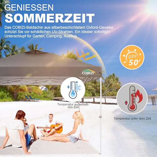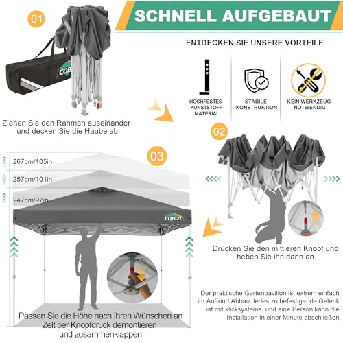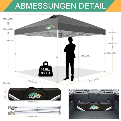 √𝙂𝙧öß𝙚:des Pavillon:3m x 3m / COBIZI Faltpavillon Verstellbarer Höhe ein Gestell alle Stahl mit Pulverbeschichtung mit 3 höhen: 185 / 195 / 205cm.(Abwärts nach oben 247 / 257 / 267cm)𝙂𝙚𝙬𝙞𝙘𝙝𝙩:12,5 kg lässt er sich leicht ringsum hin geschenkt bekommen und bietet einen temporären Unterstand für die Terrasse, Balkon, Pool, Garten, Camping, Veranstaltung, Flohmarkt oder verschiedene Aktivitäten.