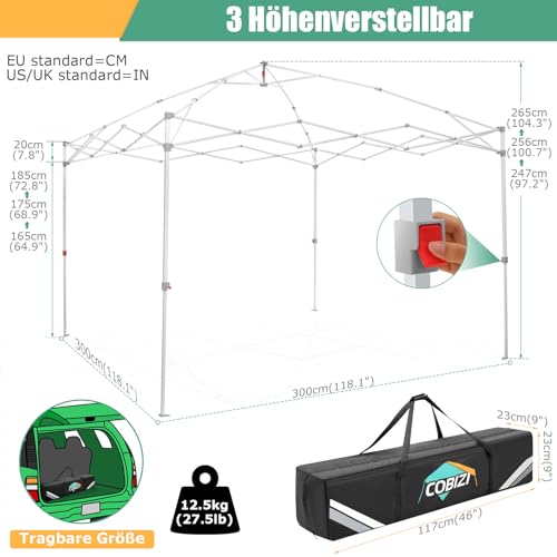 【Hervorragende Qualität】 Der Stoff für COBIZI Pavillon 3×3 nutzt die Silberbeschichtungstechnologie, um 99 % der UV-Strahlen zu blockieren. Hergestellt Aufgebraucht leichtem 190-Denier-Oxford-Gewebe, jedweder Nähte sind versiegelt und es hält einem wasserdichten Publikation von bis zu 2000 mm Wassersäule stand. Die Faltpavillon 3×3 ist im Vereinbarung zu PVC-Materialien langlebiger, alterungsbeständiger und geruchsfrei.