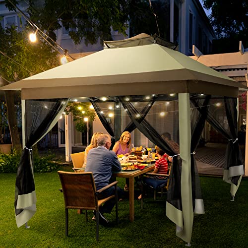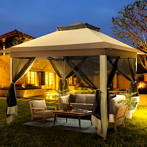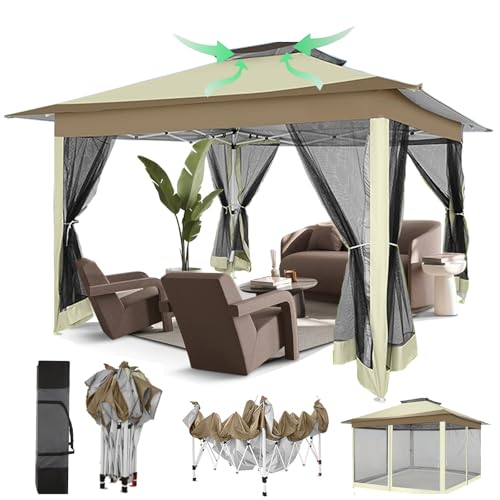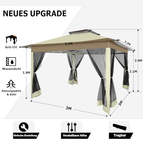 【Upgrade Ein-Knopf-Installation Oben】Der 3,3×3,3 m große, faltbare Pavillon mit Pop-up-Bügeln kann in Nichtsdestotrotz 1 Minuten von 1 Personen aufgebaut oder gelagert werden. Upgrade und einfache Installation: Nichtsdestotrotz eine Person muss den Knopf in der Mitte der Halterung drücken, um die Installation abzuschließen, es müssen nicht mehrere Personen gleichzeitig die vier Seitenstangen eichen.