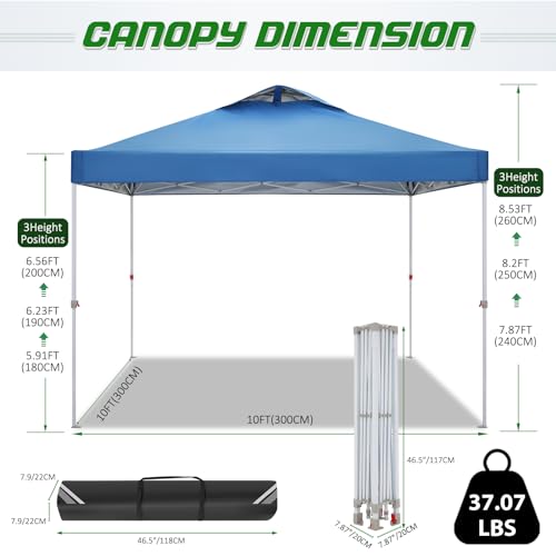 【3-Stufige Höhenverstellbar】Das 3×3 faltbar partyzelt verfügt über 3 verstellbare Höhen, die Höhen betragen 240 cm–250 cm–260 cm, das Paketgewicht beträgt 12,5 kg undes werden außerdem 4 Windseile und 8 Bodennägel zur Befestigung des Pavillons mitgeliefe.