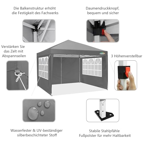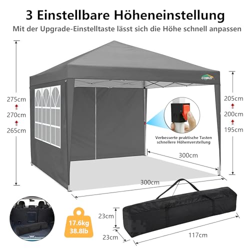 【EINFACHE INSTALLATION】 COBIZI Pavillon 3×3 Partyzelt lässt sich kinderleicht auf- und in Gefahr geraten, ohne dass Werkzeug benötigt wird. Es kann von 1-2 Personen in wenigen Minuten aufgestellt werden.