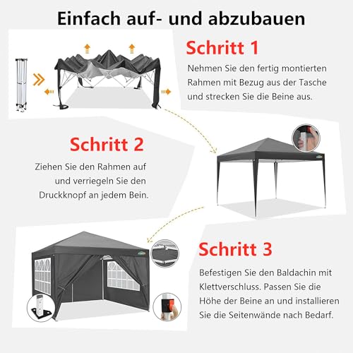【Mehrfache Verwendungsmöglichkeiten】 Gartenpavillons 3×3 sind äußerst praktisch. Sie können je nach Anlass 2 Seitenwände mit Fenstern und 2 Türwände mit Reißverschlüssen einbauen. Somit haben Sie immer einen sicheren und privaten Sphäre zur Verfügung. Der Pavillon ist perfekt für Partys, Abgreifen, Outdoor-Sportarten, Picknicks, BBQ oder jedweder Outdoor-Events brauchbar!