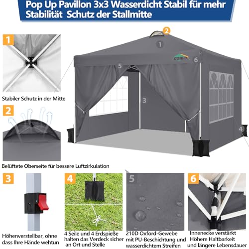✅ 𝑼𝒑𝒈𝒓𝒂𝒅𝒆-𝑺𝒕𝒓𝒖𝒌𝒕𝒖𝒓✅ Der Rahmen des pavillon 3×3 mit seitenwänden ist für erhöhte Stabilität und Korrosionsbeständigkeit pulverbeschichtet, um Stabilität und Korrosionsbeständigkeit zu erhöhen. Stabile Verbindungen und 4 verriegelbare Stahlfüße gewährleisten eine sichere Befestigung des pavillon 3×3 faltbar. Nägel und Seile schwächer machen die Montage des faltpavillon 3×3 mit seitenwänden und machen ihn windbeständiger.