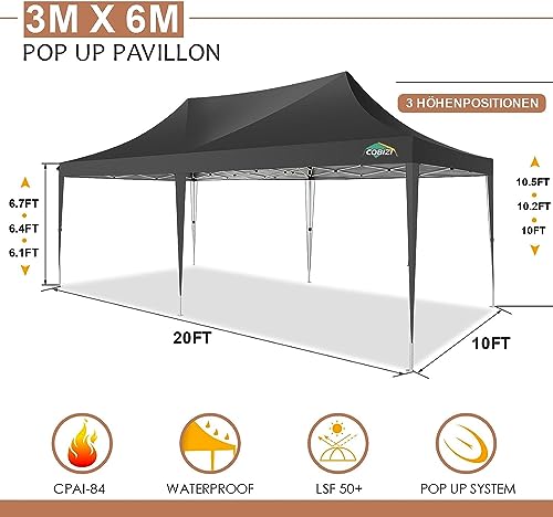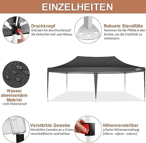 【VERSCHIEDENE HÖHENOPTIONEN】 Der cobizi Faltpavillon ist höhenverstellbar, Sie können ihn nach Ihren Bedürfnissen eichen, 300 cm – 310 cm – 321 cm, Sie müssen allerdings mit dem Daumen drücken, um ihn leicht einzustellen. Das verbesserte Daumenverriegelungssystem lässt sich leicht verbarrikadieren und abschnallen und schützt die Finger vor dem Einklemmen.