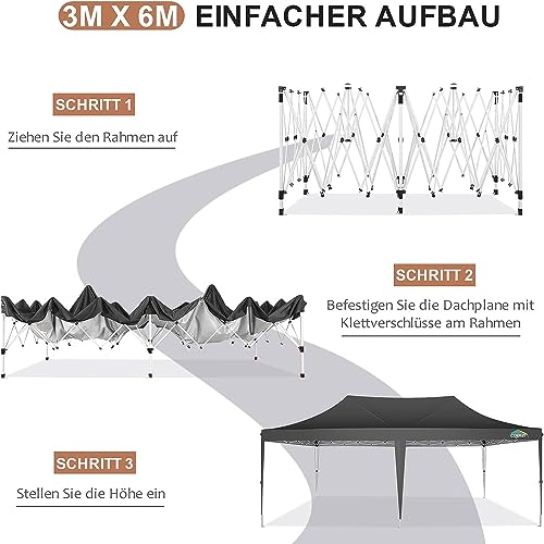 【SEHR EINFACH ZU MONTIEREN】 Der cobizi 3×6 Faltpavillon benötigt kein Werkzeug, allerdings 1-2 Personen können ihn. Es kann platzsparend in der Laufradtasche verstaut werden, wenn Sie es nicht verwenden. Der Pavillon bietet in Hülle und Fülle Platz und bietet Platz für 12-16 Personen.Dieses Zelt eignet sich für Gärten, Hochzeiten, Innenhöfe, Versammlungen, Partys und Geschäftsveranstaltungen usw.