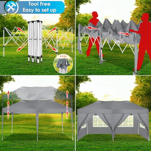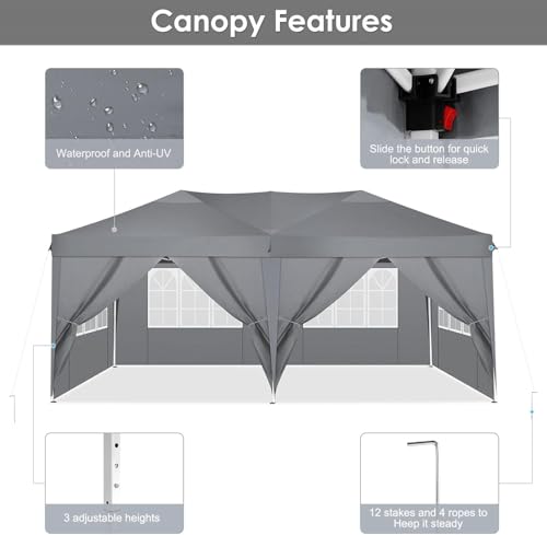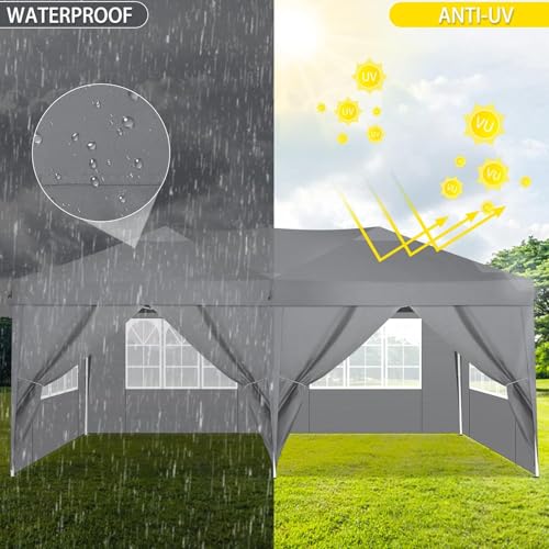 Abnehmbare Seitenwände: 3×6 Pop up pavillon mit Seitenteilen enthält 6 Seitenwände mit 2 Reißverschlüssen und 4 Fenstern. Sie können alle oder einige davon gleichzeitig verwenden. Die 4 Seitenwände haben Fenster, die Licht hereinlassen. Sie können beispielsweise einen Faltpavillon mit allen Seitenwänden aufstellen oder im Winter einen Faltpavillon ohne Seitenwände aufstellen.