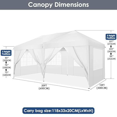 Einstellbare Höheneinstellung: Das 3×6 partyzelt hat 3 einstellbare höhen:2.70/2.64/ 2.58m. Sie können die Höhe des Überdachungszeltes nach Ihren wünschen ummünzen. und die 12 stahlnagel und 4 seile machen diesen baldachin belastbar und robust.