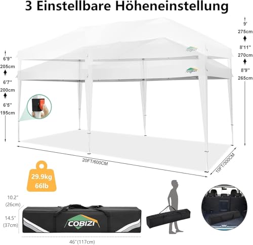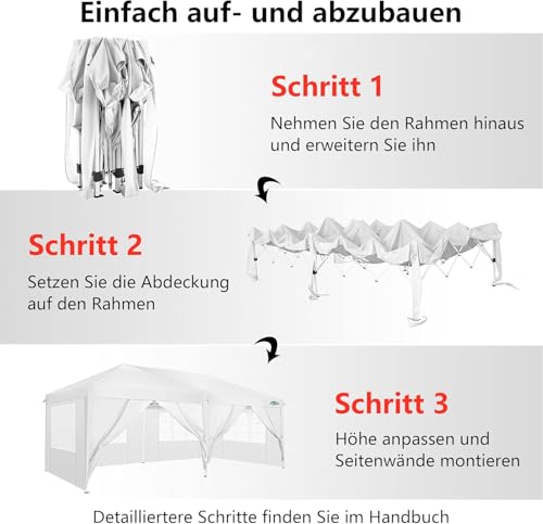 【Großer verstellbarer Kosmos】 3 höhenverstellbare Einstellungen (195cm, 200cm, 205cm) bieten Anpassungsfähigkeit. Das pavillon 3×6 bietet 18m² Platz und ist ideal für 10-15 Personen. Perfekt für Picknicks, Partys und Outdoor-Aktivitäten. Dieses zelt 3x6m ist groß genug, um einen Picknicktisch zu beschatten und bietet optimalen Sonnenschutz.