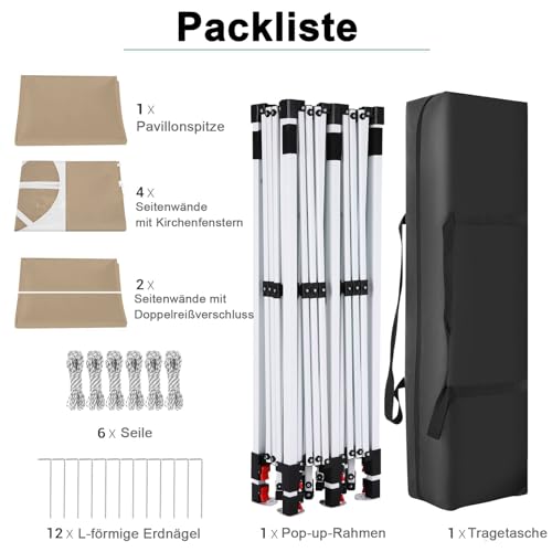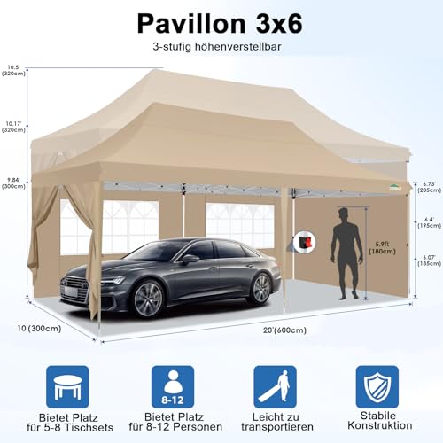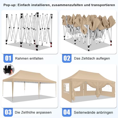 Einfach zu hinzufügen: Es sind keine Werkzeuge erforderlich, zugegeben zwei Personen können dieses faltbare partyzelt 3×6 wasserdicht abgehärtet in wenigen Minuten aufbauen.Mit einem fingerklemmsicheren Knopf kann die Höhe auf 300 – 310 – 320 cm eingestellt werden.
