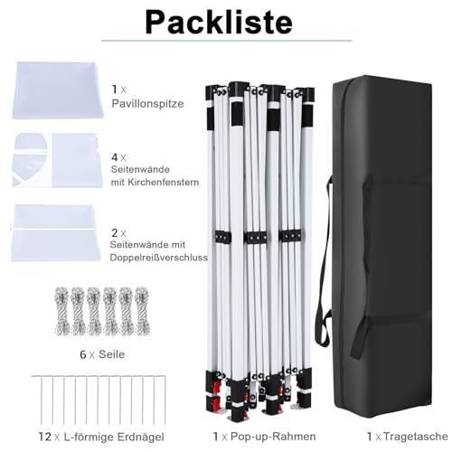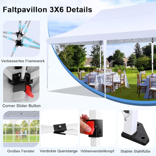 Einfach zu montieren: Es sind keine Werkzeuge erforderlich, nur zwei Personen können dieses faltbare partyzelt 3×6 wasserdicht stabil in wenigen Minuten aufbauen.Mit einem fingerklemmsicheren Knopf kann die Höhe auf 300 – 310 – 320 cm eingestellt werden.