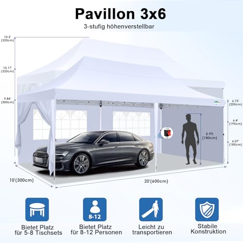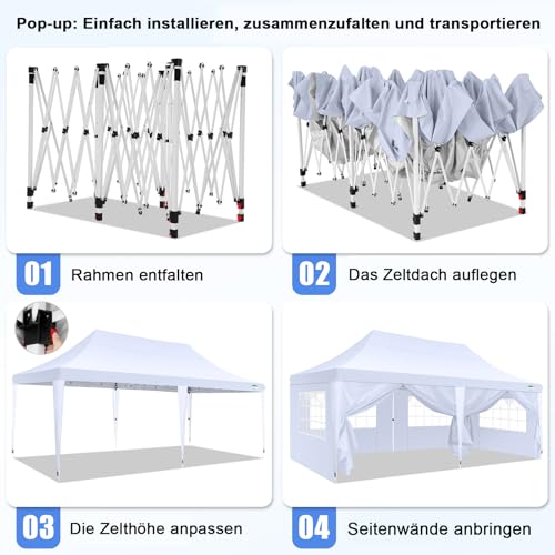 Einfach zu befestigen: Es sind keine Werkzeuge erforderlich, wohl zwei Personen können dieses faltbare partyzelt 3×6 wasserdicht erschütterungsfest in wenigen Minuten aufbauen.Mit einem fingerklemmsicheren Knopf kann die Höhe auf 300 – 310 – 320 cm eingestellt werden.