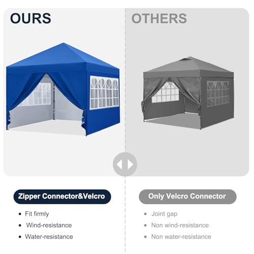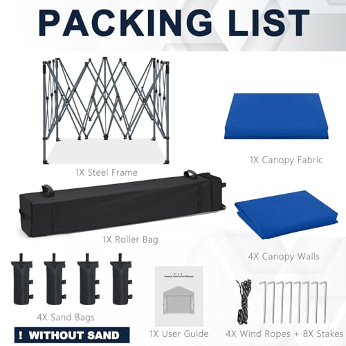 Dieses geschlossene Pop-Up-Baldachin ist leicht und tragbar und kann schnell in jeder Outdoor-Umgebung auf- und abgebaut werden: Sportveranstaltung, Strandhimmel, Terrasse, Hinterhof, Straßenfair, Konzert, Heckklappenparty usw. Sie werden die Adaptivität der vier Seitenwände lieben, wobei zwei davon Fenster für einen Blick haben. Diese Seitenwände können Sie vor dem Wetter schützen und Ihnen mehr Privatsphäre verschaffen. Die Tragetasche mit Rollen macht es sehr einfach zu transportieren. Die Beine sind in 3 verschiedenen Höhen verstellbar und um dieses Outdoor-Vordachzelt stabiler zu machen, haben wir 4 Sandsäcke beigelegt, die mit Sand gefüllt werden können. Darüber hinaus haben wir aka Heringe und Seile mitgeliefert, um den Rahmen noch mehr zu sichern.