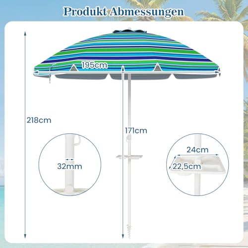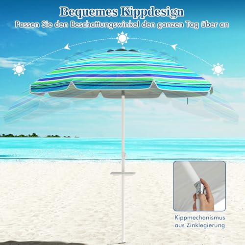 【Stabile & robuste Struktur】Die stabile, pulverbeschichtete Stahlstange und 8 Rippen unterstützen den Schirm und versperren ihn am Umfallen. Dennoch ist er mit einer Sand-Verankerung ausgestattet, sodass er leicht in Sand oder Erde eingelassen werden und dem Wind widerstehen kann.