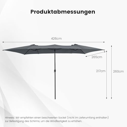 【Einzeln große Schattierungsfläche】Der doppelseitige Sonnenschirm hat eine Größe von 426 x 265 x 260 cm (L x B x H) und bietet eine große Schattierungsfläche von 11,5 m³ für Ihre Outdoor-Aktivitäten. Er eignet sich für Innenhöfe, Terrassen, Gärten, Strände, Poolbereiche, Terrassen, Cafés oder andere Wohn- oder Gewerbebereiche.