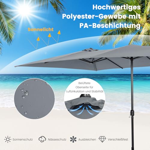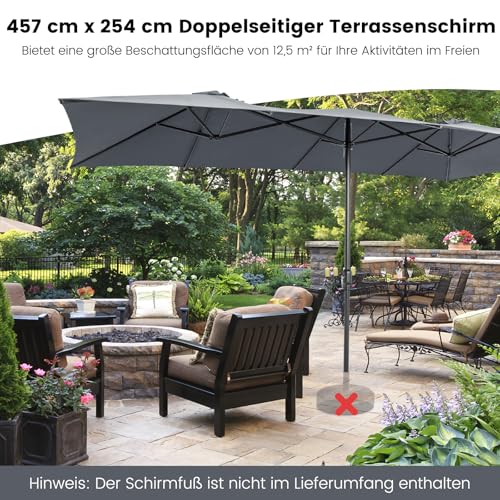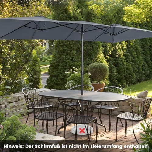 Unser 426 cm großer doppelseitiger Sonnenschirm bietet großzügigen Schatten für eine Sitzgruppe, damit Sie Freizeit mit Freunden oder Familie im schönen Garten, auf der Terrasse oder Terrasse genießen können. Dank des praktischen Kurbelgriffs können Sie den Schirm leicht öffnen oder Schlussfolgern, indem Sie den Griff drehen. Darüber hinaus besteht das Schirmtuch ganz hochwertigem Polyesterstoff mit PA-Beschichtung, der regenbeständig, sonnenschutz, wärmeisolierend ist und besseren Abschirmung im Freien bietet. Darüber hinaus wird das Schirmtuch von einer pulverbeschichteten 10-Rippen-Metallstruktur gestützt, die für hervorragende Stabilität und ausgezeichnete Rostbeständigkeit sorgt. Ob für den privaten oder gewerblichen Gebrauch, unser großer doppelseitiger Sonnenschirm kann eine perfekte Synchronisation sein!