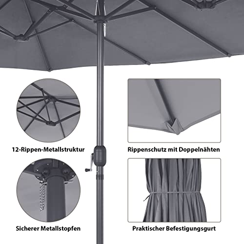 Suchen Sie einen Sonnenschirm, der Ihnen eine große Schattenfläche und einen bequemen Entspannungsort bietet? Unser Sonnenschirm in doppelter Größe ist die ideale Abstimmung. Der Doppelsonnenschirm blockiert zusätzliches Sonnenlicht und schafft einen großen schattigen Fragment. Ausgestattet mit einer praktischen Handkurbel können Sie den Terrassenschirm reibungslos öffnen und Abstrahieren. Wenn der Schirm nicht verwendet wird, vergessen Sie nicht, den Befestigungsgurt für eine längere Nutzungsdauer zu verwenden. Außerdem passt unser Doppelsonnenschirm perfekt zu verschiedenen Orten und bringt einen gemütlichen und schattigen Platz zum Entspannen.