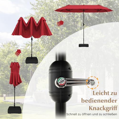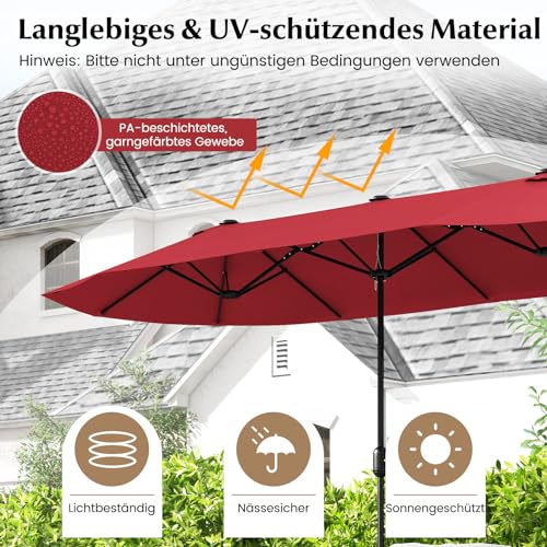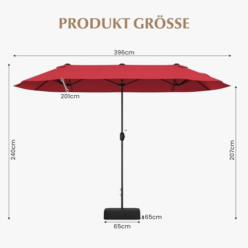 Mit den beeindruckenden Abmessungen von 396 x 201 cm bietet der doppelseitige Terrassenschirm einen vergrößerten Schattenraum für Ihre Terrassenmöbel und eignet sich somit perfekt für Partys, kommerzielle Veranstaltungen und Familienfeiern. Und die Lüftungsschlitze Acht geben ein kühles Erlebnis. Das Schirmdach besteht aus PA-beschichtetem, garngefärbtem Stoff und abgefärbt nicht so leicht. Gleichzeitig schützt Sie das strapazierfähige und UV-schützende Material vor schädlichen Strahlen und leichtem Regen. Der stabile Rahmen sorgt für maximale Stabilität auch bei Wind. Darüber hinaus geben 12 Schirmrippen zusätzlichen Windschutz. Für zusätzliche Stabilität bieten wir einen enthaltenen befüllbaren Gewichtsständer an.